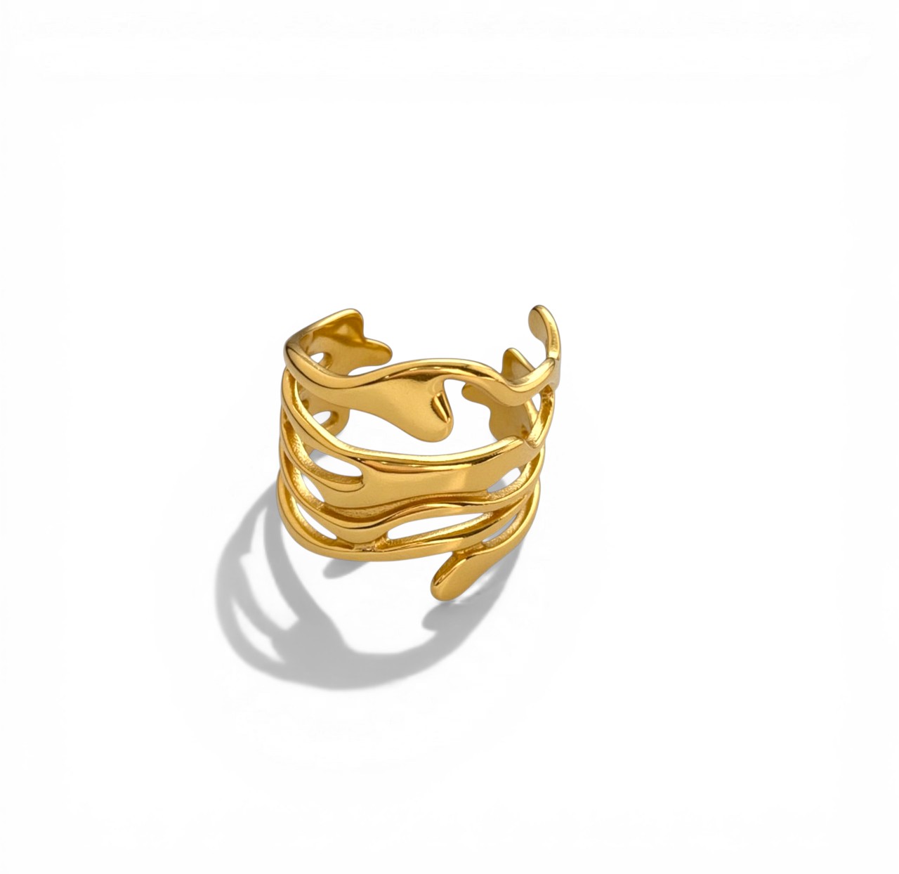 Anel Alga, em aço premium com banho de ouro 18k possui design orgânico e fluido, formado por camadas abertas que criam um visual moderno e sofisticado. Ajustável e confortável, é perfeito para quem busca um acessório estiloso e cheio de personalidade.
