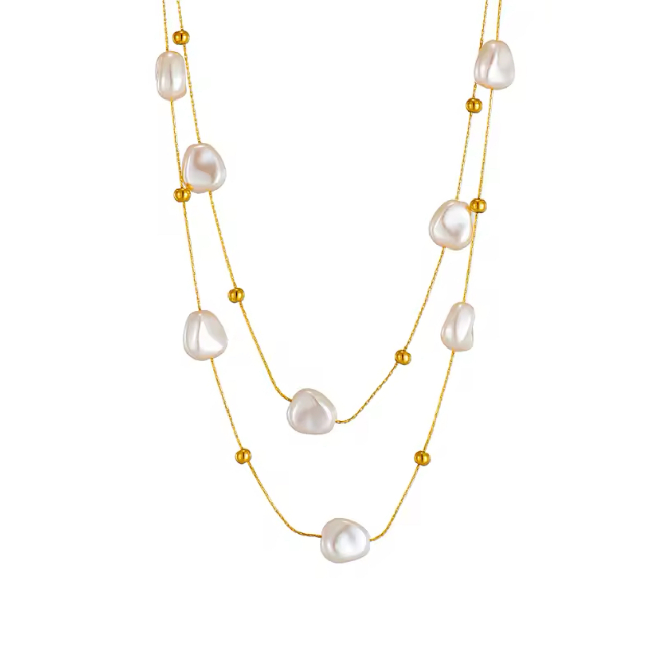 Colar Duplo Pérolas Orgânicas: Este colar é a definição de elegância e sofisticação. Em Aço Premium, composto por duas camadas de pérolas orgânicas, ele exala um charme delicado e atemporal. O banho em ouro 18k das correntes adiciona um brilho luxuoso, enquanto as pérolas oferecem um toque clássico. Ideal para quem busca um acessório versátil e refinado, perfeito para qualquer ocasião.