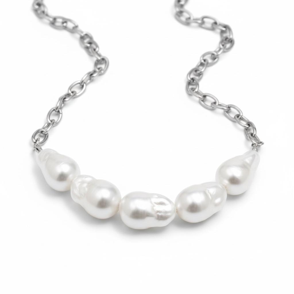 O Colar Glow Metálico combina a modernidade da corrente em aço premium com a sofisticação das pérolas de formato orgânico e irregular, criando um visual contemporâneo e cheio de personalidade.