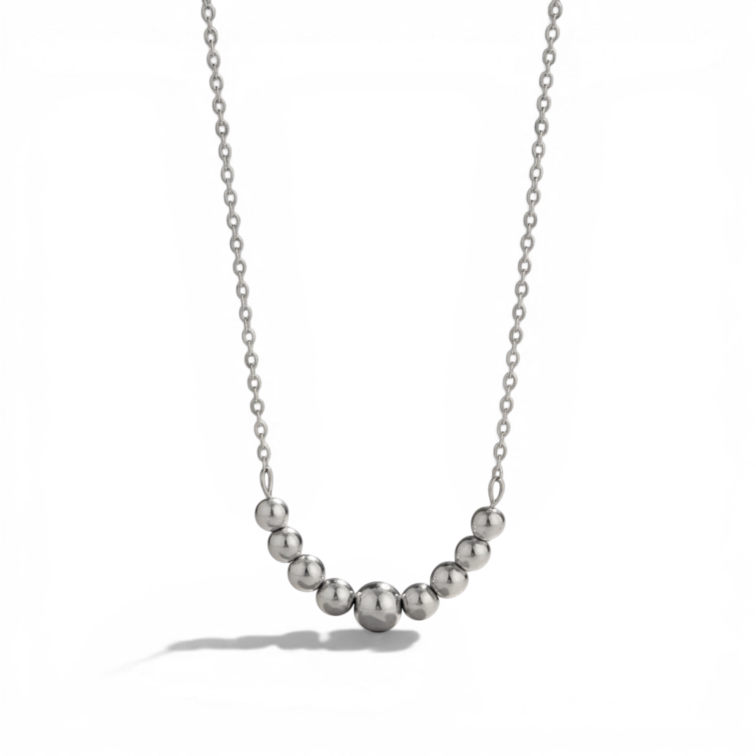Colar com design clean e sofisticado, formado por esferas metálicas que criam um efeito visual equilibrado e elegante. A versão em Aço Premium traz um brilho moderno e versátil, ideal para composições minimalistas ou combinações em camadas.