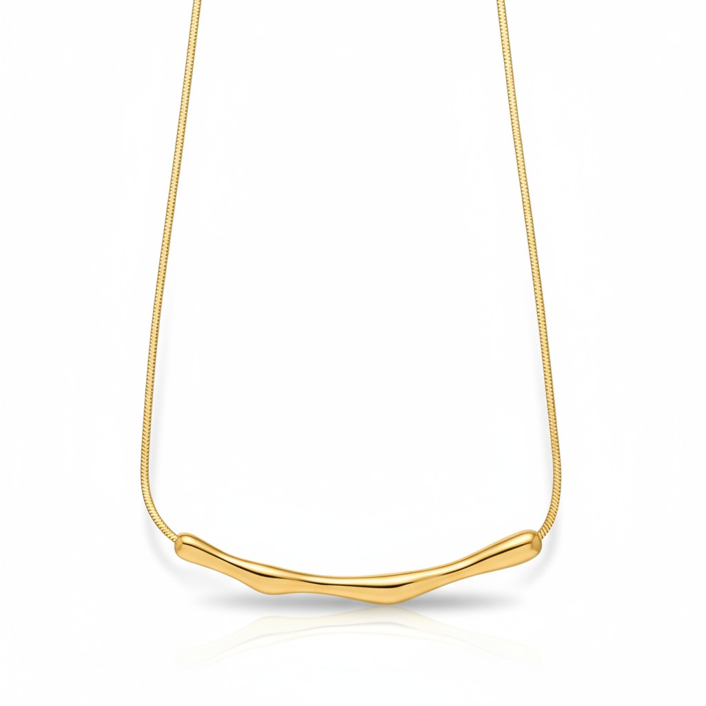 O destaque fica por conta do pingente de traço assimétrico, com curvas sutis e acabamento espelhado que transmite fluidez e naturalidade. Produzido em aço premium com banho de ouro 18K, combina o brilho quente do ouro com o toque artístico de um desenho orgânico e envolvente.