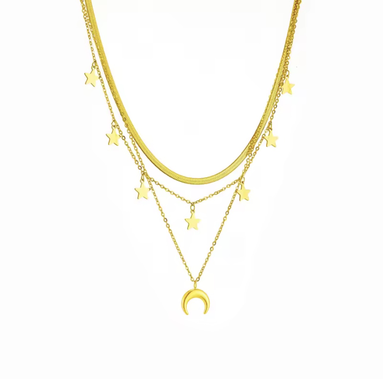 Colar Triplo Stars em aço premium, com banho dourado de alto brilho em ouro 18k e design em camadas que cria um efeito sofisticado e atual. Composto por três correntes harmonizadas entre si — uma malha mais estruturada, uma corrente delicada com estrelas pendentes e um pingente de lua crescente — a peça traz leveza, movimento e um toque celestial ao visual.