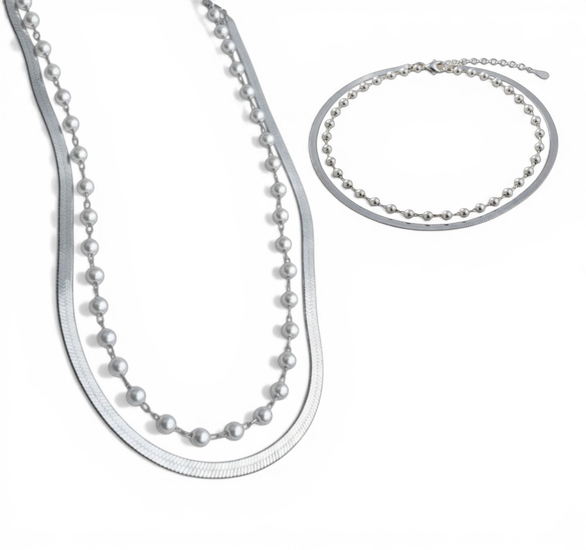 Conjunto composto por colar e pulseira dupla, criando um visual sofisticado e perfeitamente equilibrado.