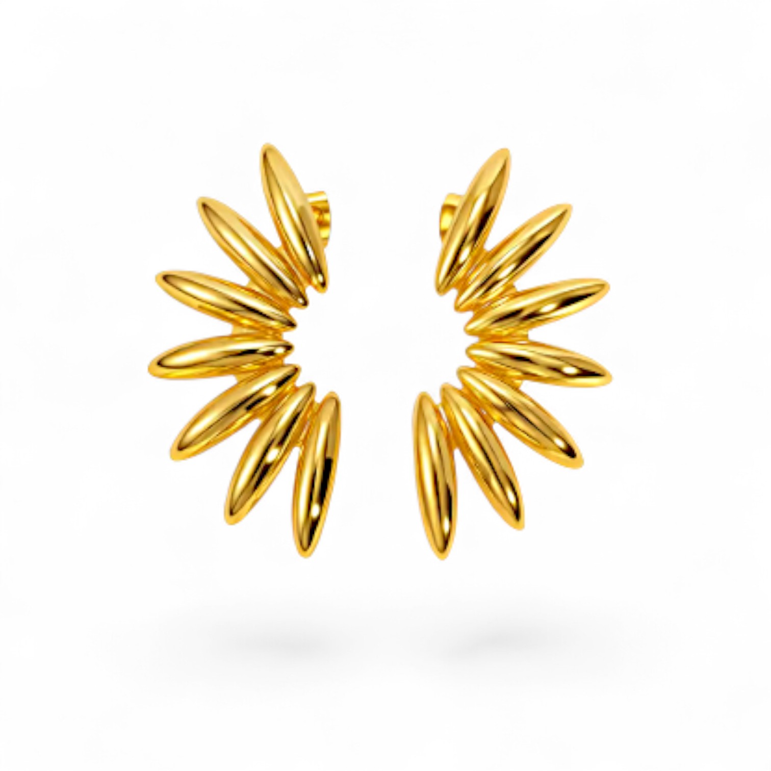 Seu design escultural, em formato de pétalas geométricas, cria um efeito de brilho em movimento — uma verdadeira obra de arte contemporânea que ilumina o rosto com elegância futurista. Em Aço Premium com Banho de Ouro 18k.