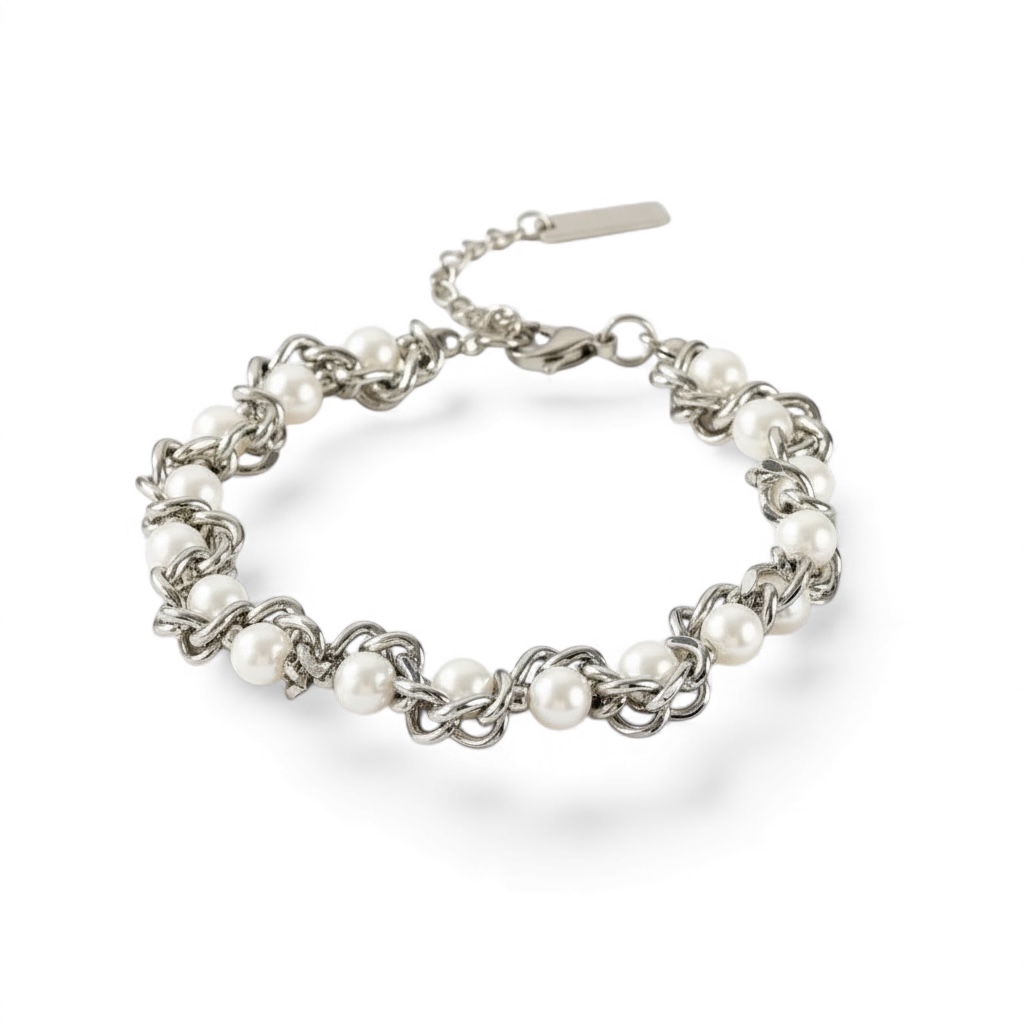 Pulseira em aço premium com pérolas, que une a força dos elos metálicos à delicadeza do brilho perolado. Atemporal, sofisticada e perfeita para elevar qualquer produção, do casual ao elegante.