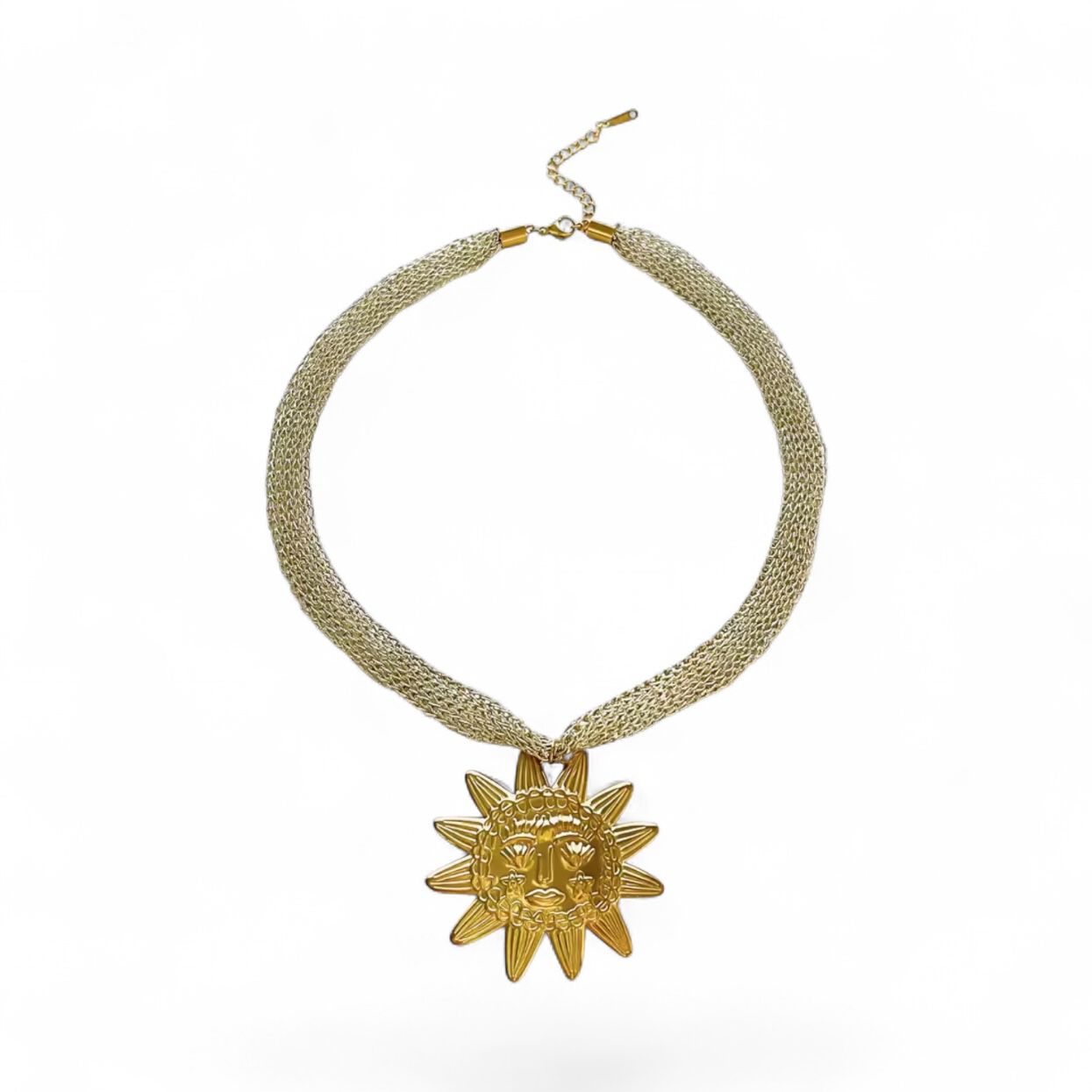 Inspirado no poder e na energia vital do sol, este colar une a modernidade do lenço em trama metalizada ao pingente Astro Rei, produzido em aço premium com banho de ouro 18k.